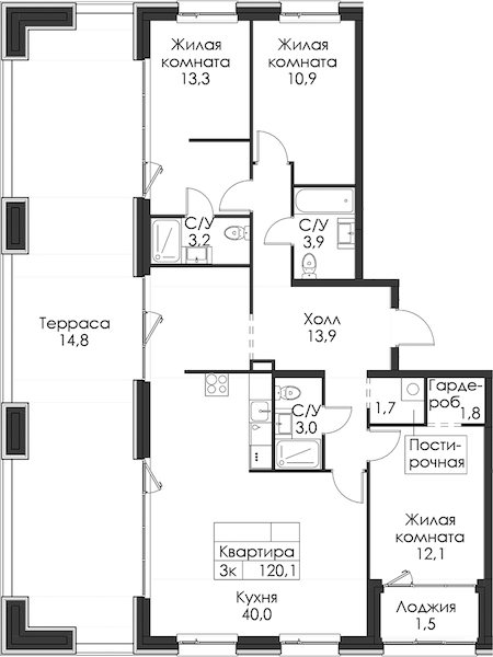 Трёхкомнатная квартира на 8-ом этаже 120,1 кв.м