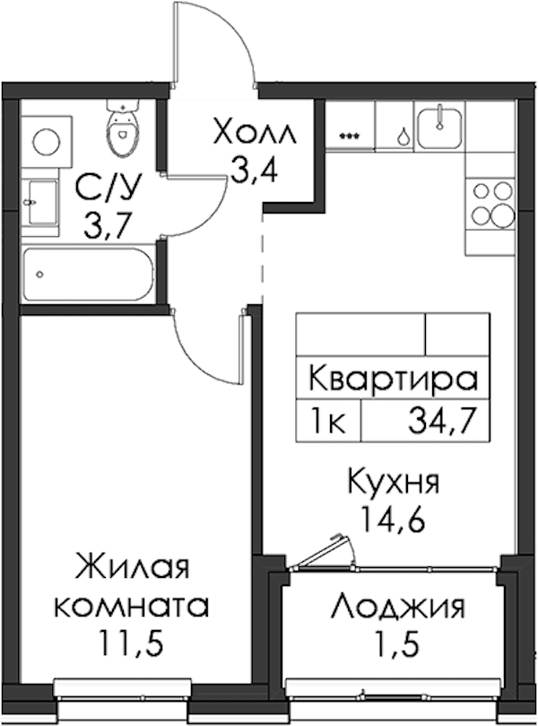 Однокомнатная квартира на 1-ом этаже 34,7 кв.м