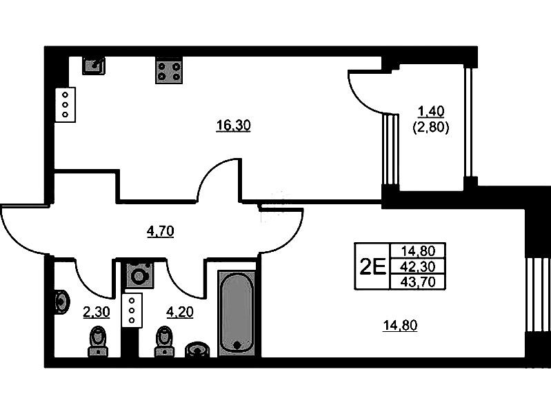 Однокомнатная квартира на 8-ом этаже 43,7 кв.м