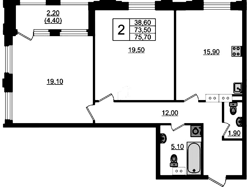 Двухкомнатная квартира на 9-ом этаже 75,7 кв.м