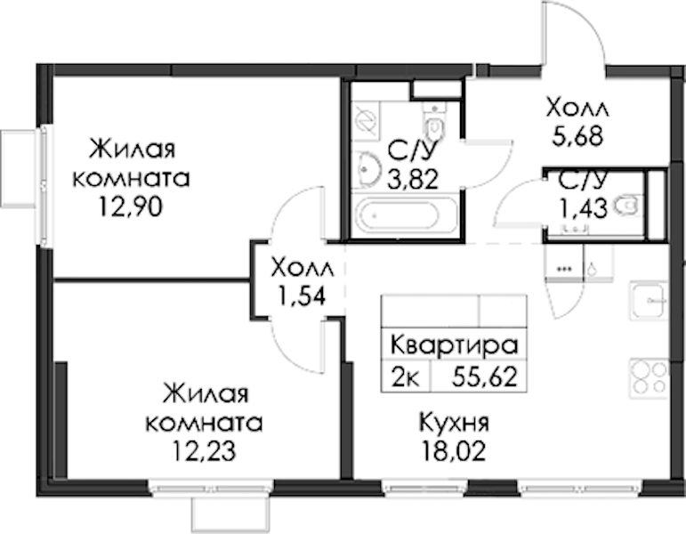 Двухкомнатная квартира на 10-ом этаже 55,62 кв.м