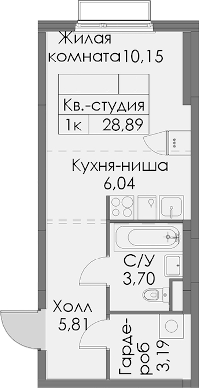 Квартира-студия на 10-ом этаже 28,89 кв.м