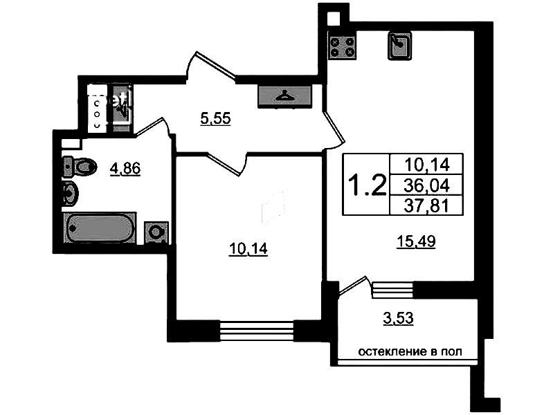 Однокомнатная квартира на 10-ом этаже 36,04 кв.м