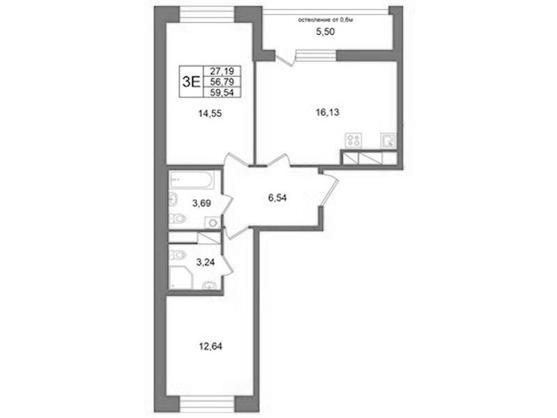 Двухкомнатная квартира на 3-ем этаже 56,79 кв.м