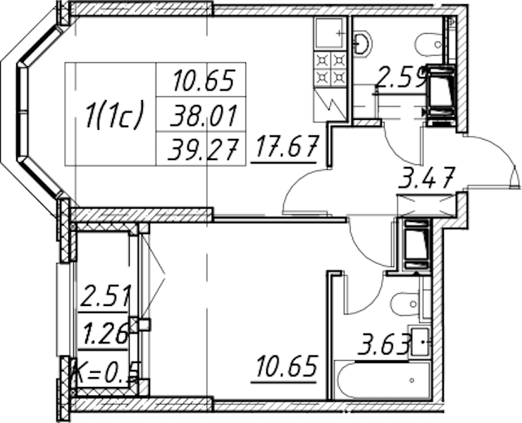 Однокомнатная квартира на 12-ом этаже 39,27 кв.м
