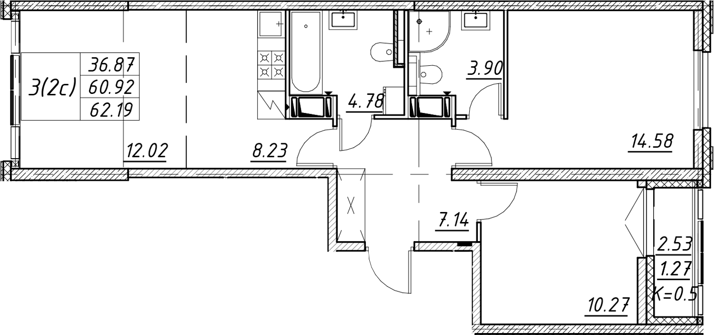 Двухкомнатная квартира на 15-ом этаже 62,19 кв.м