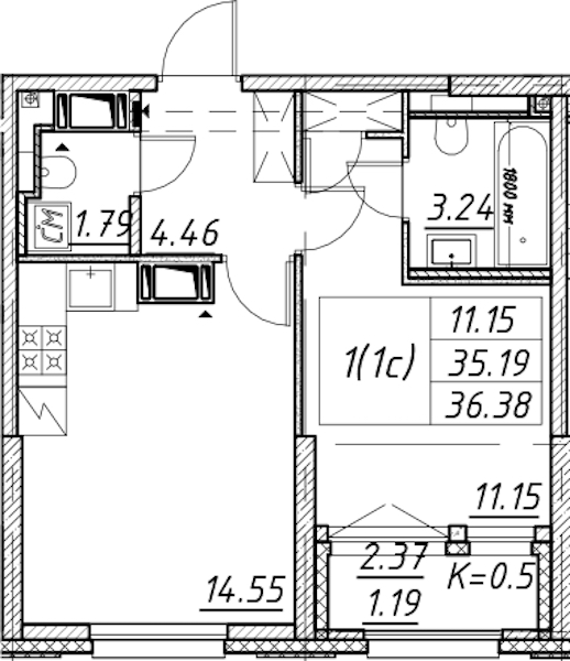 • Площадь36,38 м2