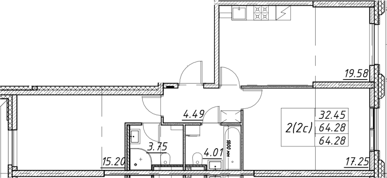 Двухкомнатная квартира на 2-ом этаже 64,28 кв.м