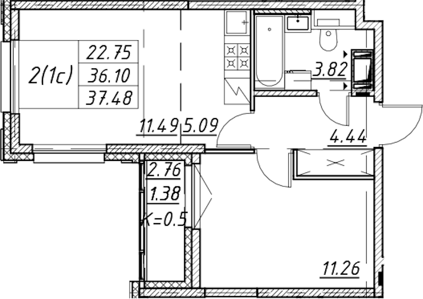 Однокомнатная квартира на 7-ом этаже 37,48 кв.м