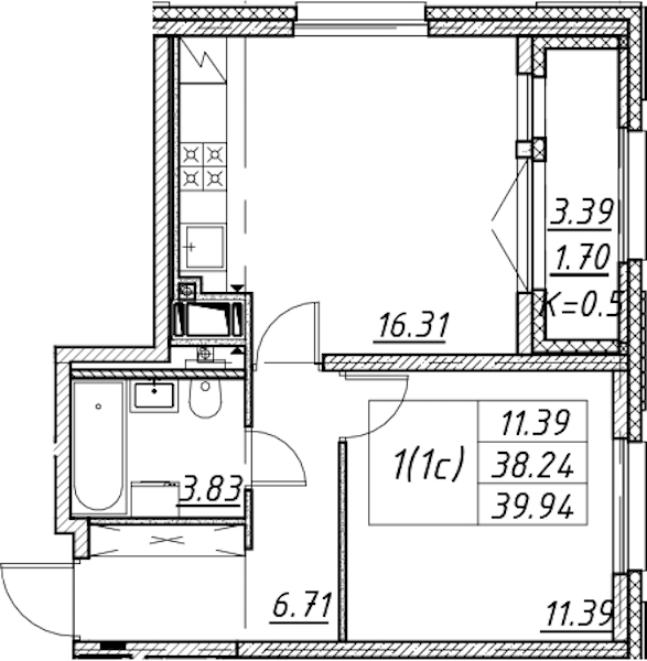 Однокомнатная квартира на 7-ом этаже 39,94 кв.м