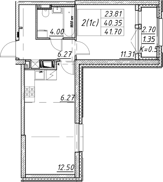 Однокомнатная квартира на 7-ом этаже 41,7 кв.м
