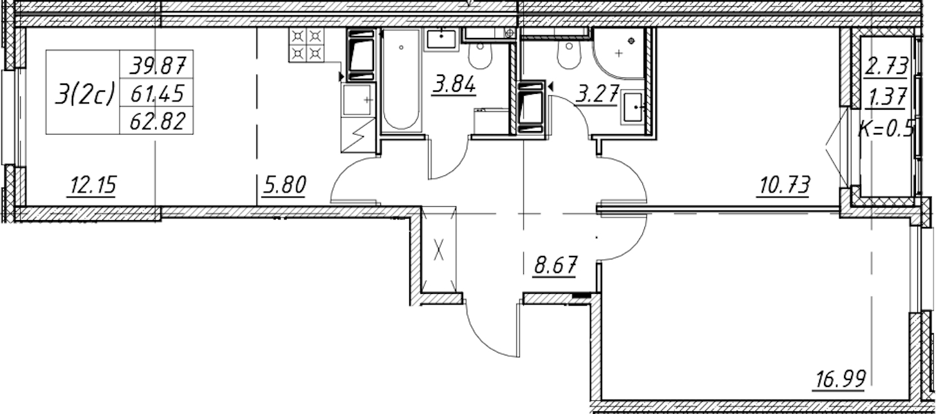 • Площадь62,82 м2