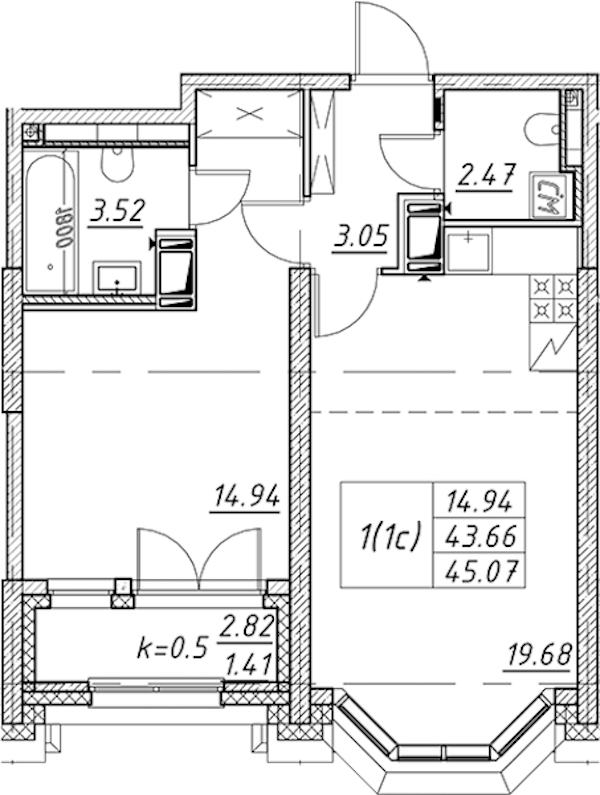 Однокомнатная квартира на 6-ом этаже 45,07 кв.м