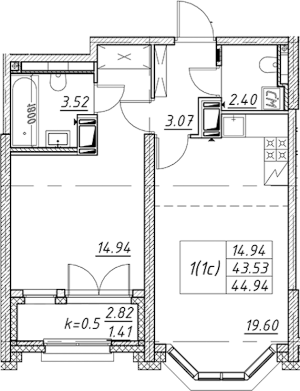 Однокомнатная квартира на 10-ом этаже 44,94 кв.м