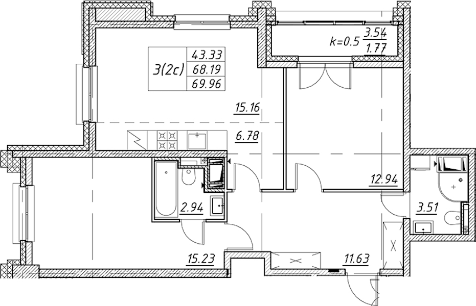 Двухкомнатная квартира на 14-ом этаже 69,96 кв.м