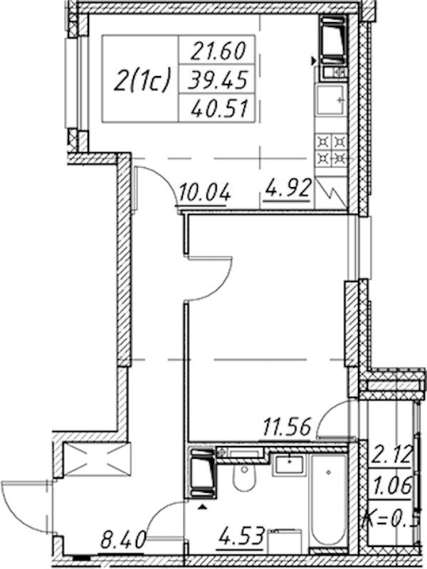 Однокомнатная квартира на 7-ом этаже 40,51 кв.м