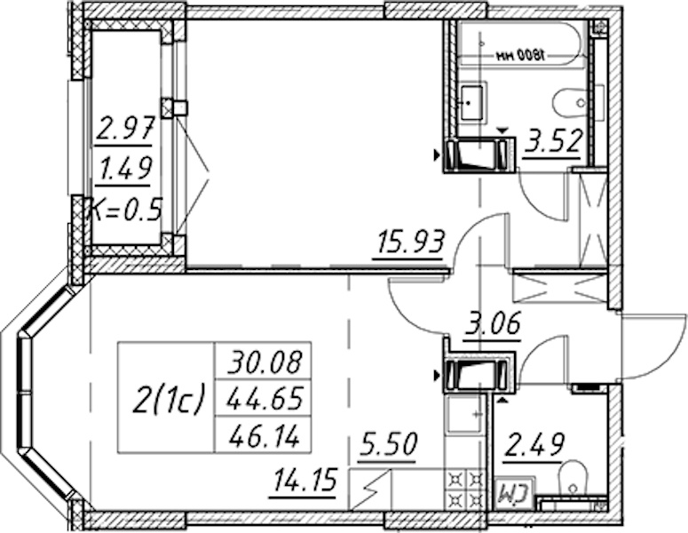 • Площадь46,14 м2