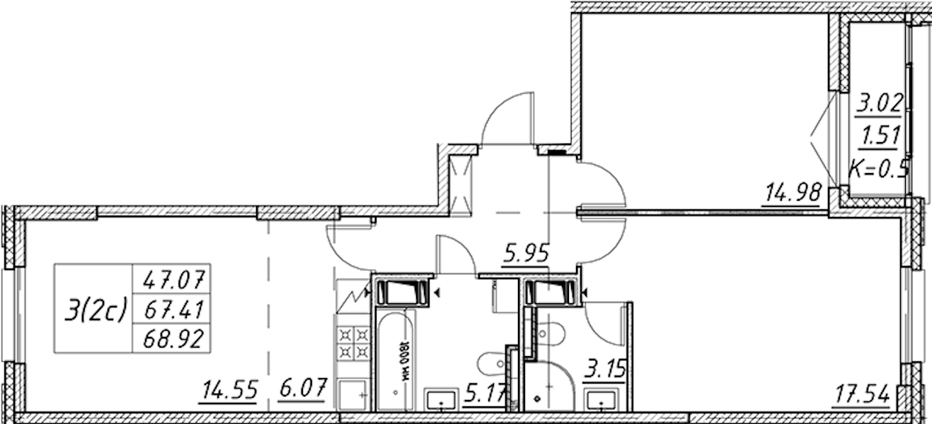 Двухкомнатная квартира на 10-ом этаже 68,92 кв.м