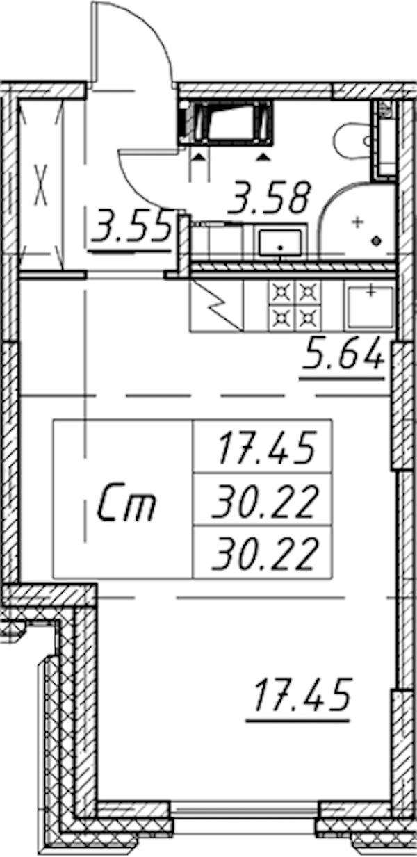 Квартира-студия на 3-ем этаже 30,22 кв.м