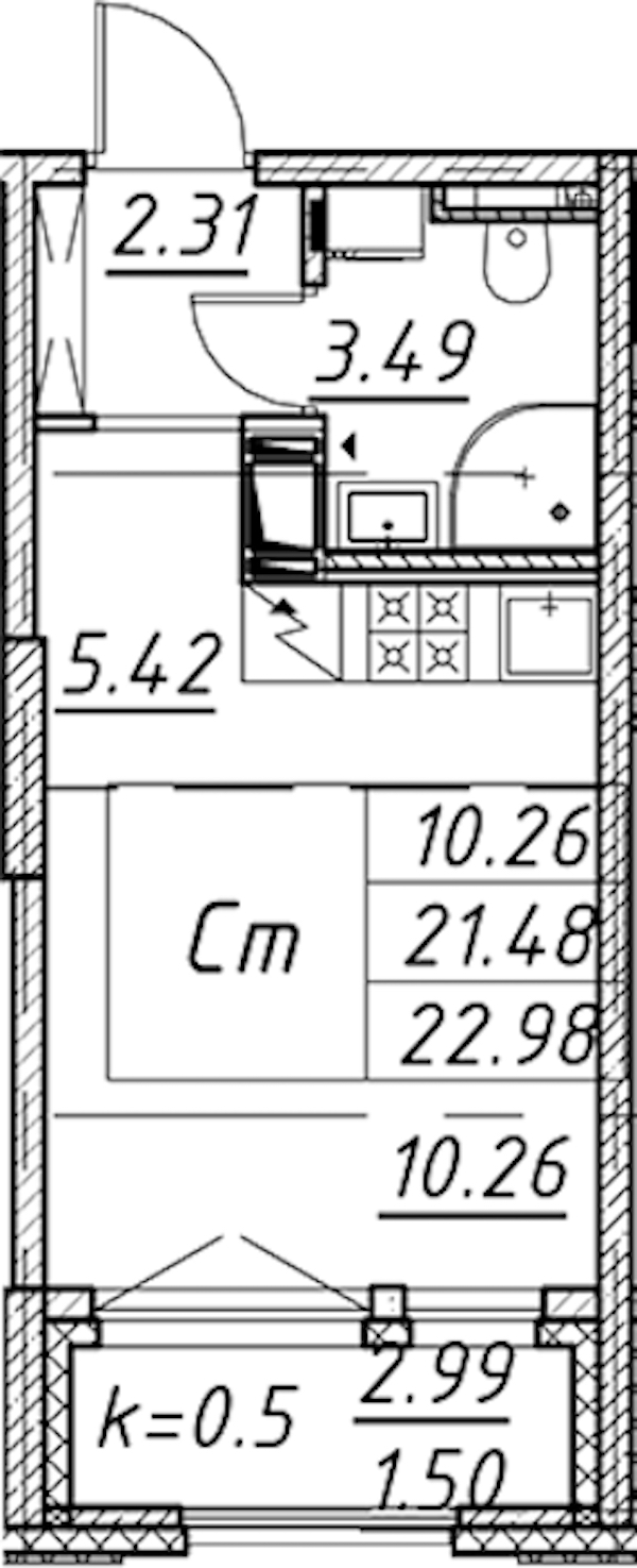 Квартира-студия на 13-ом этаже 22,98 кв.м