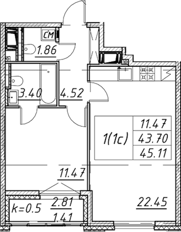 Однокомнатная квартира на 13-ом этаже 45,11 кв.м