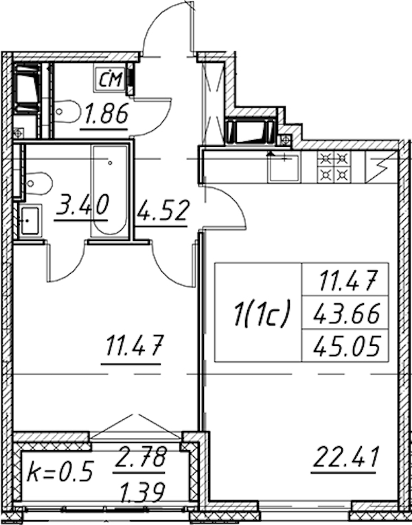 Однокомнатная квартира на 12-ом этаже 45,05 кв.м