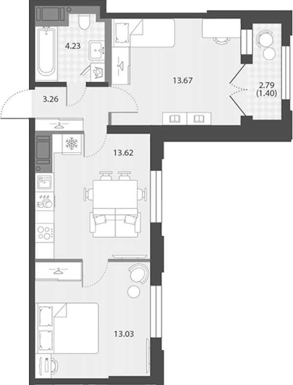 Двухкомнатная квартира на 13-ом этаже 49,21 кв.м