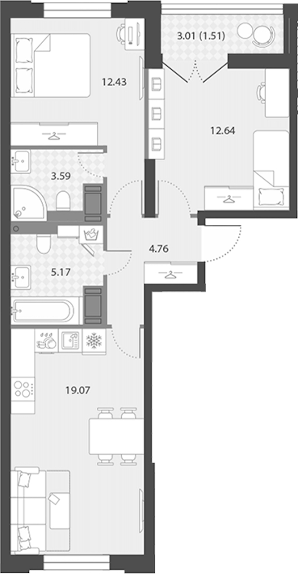 Двухкомнатная квартира на 16-ом этаже 59,17 кв.м