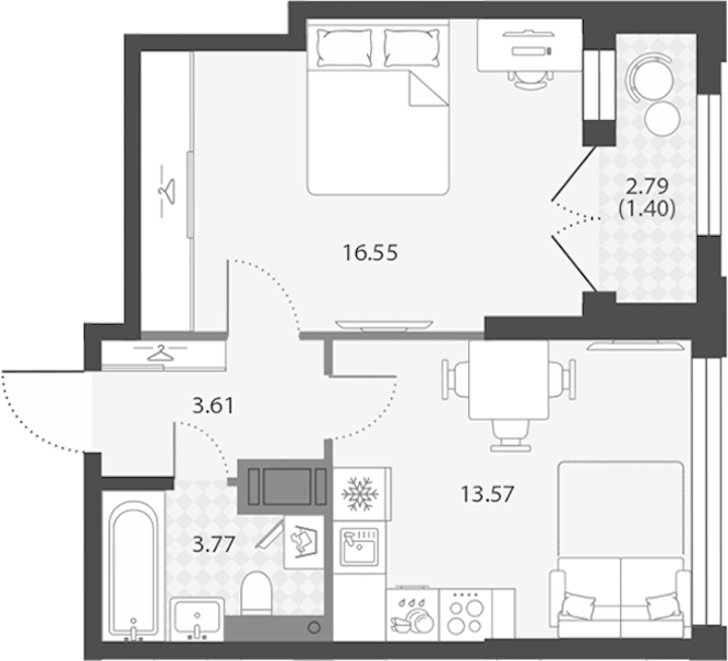 Однокомнатная квартира на 17-ом этаже 38,9 кв.м
