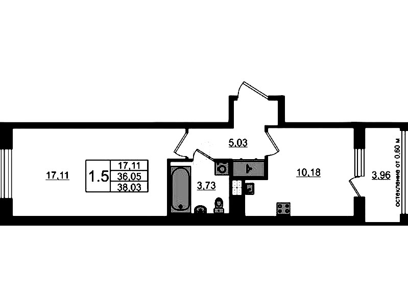 Однокомнатная квартира на 4-ом этаже 36,05 кв.м