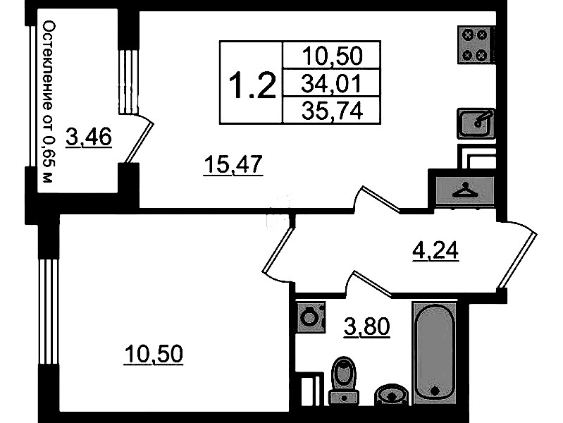 Однокомнатная квартира на 1-ом этаже 33,5 кв.м