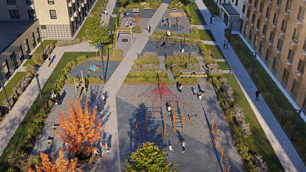 • В квартал входят 3 детских сада, школа и 7 жилых домов с дворами-парками, куда не могут зайти посторонние люди и заехать автомобили. Во дворах приятно отдыхать, знакомиться с соседями и даже заниматься йогой, а для детей мы построим детские площадки. Рядом появятся современные спортивные площадки. На первых этажах домов откроются магазины, кафе и другие сервисы. Через весь жилой район протянется широкий пешеходный бульвар для прогулок и спорта.