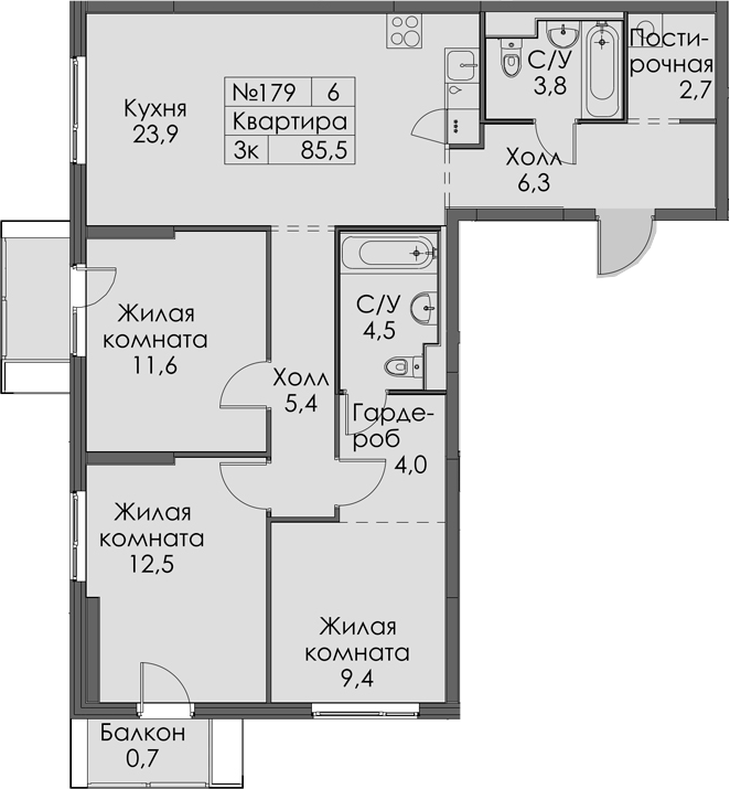 Трёхкомнатная квартира на 5-ом этаже 85,5 кв.м