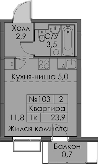 Квартира-студия на 11-ом этаже 23,9 кв.м