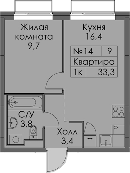 Однокомнатная квартира на 2-ом этаже 33,3 кв.м