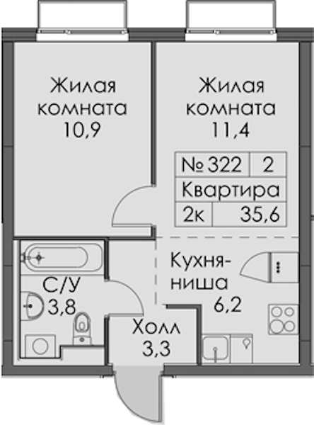 - Площадь35,6 м2