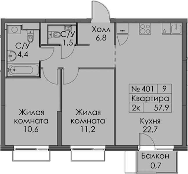 - Площадь57,9 м2