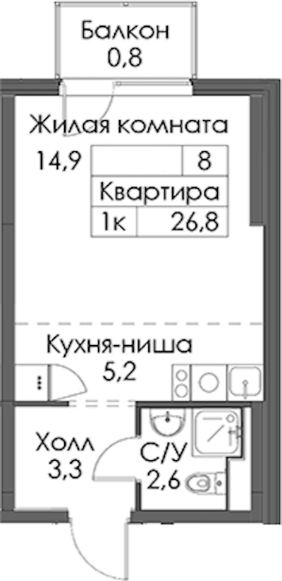 Квартира-студия на 12-ом этаже 26,8 кв.м