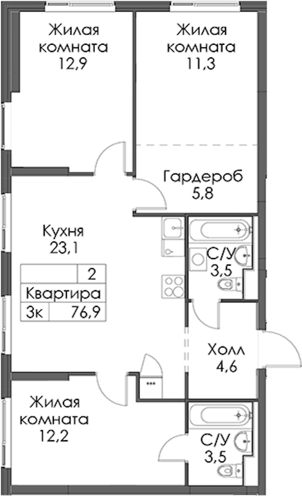 - Площадь76,9 м2