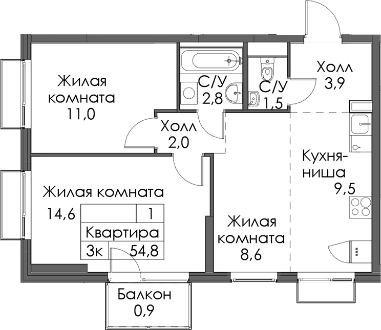 Двухкомнатная квартира на 12-ом этаже 54,8 кв.м