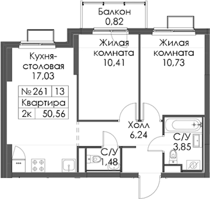 Двухкомнатная квартира на 17-ом этаже 50,56 кв.м