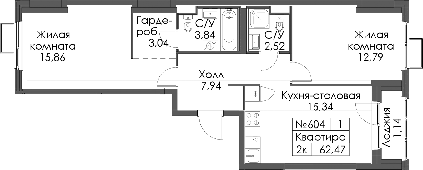 Двухкомнатная квартира на 16-ом этаже 62,47 кв.м