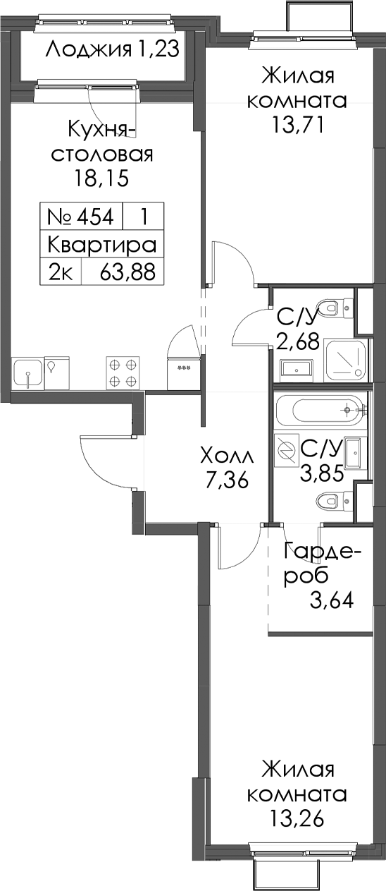 Двухкомнатная квартира на 5-ом этаже 63,88 кв.м