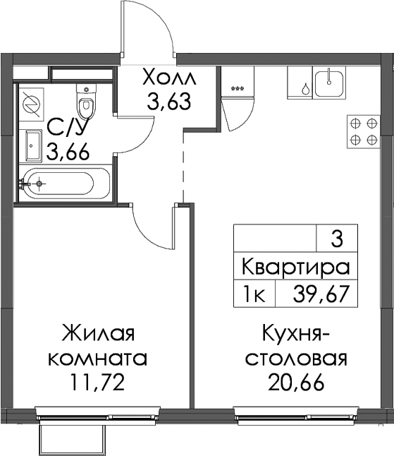 Однокомнатная квартира на 6-ом этаже 39,67 кв.м