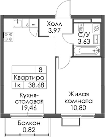 Однокомнатная квартира на 3-ем этаже 38,68 кв.м