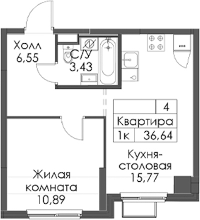 Однокомнатная квартира на 10-ом этаже 36,64 кв.м
