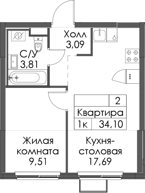 Однокомнатная квартира на 14-ом этаже 34,1 кв.м
