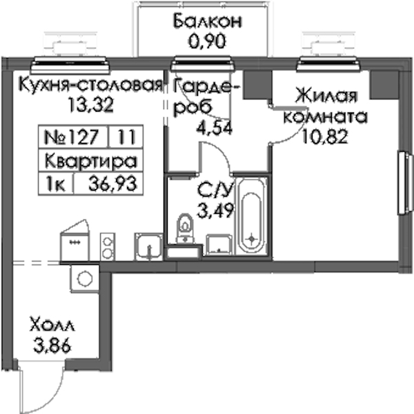 Однокомнатная квартира на 15-ом этаже 36,93 кв.м