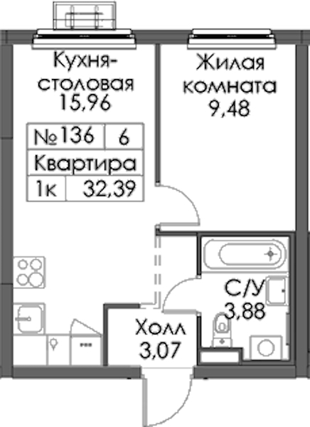 Однокомнатная квартира на 14-ом этаже 32,39 кв.м