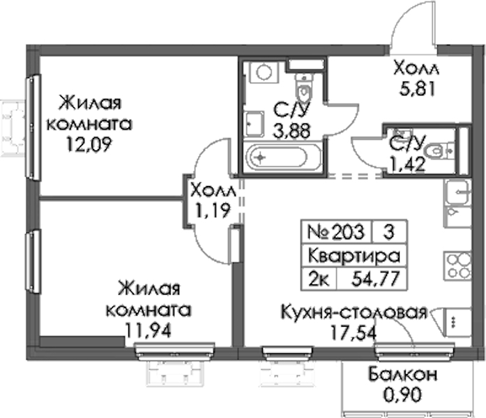 Двухкомнатная квартира на 19-ом этаже 54,77 кв.м